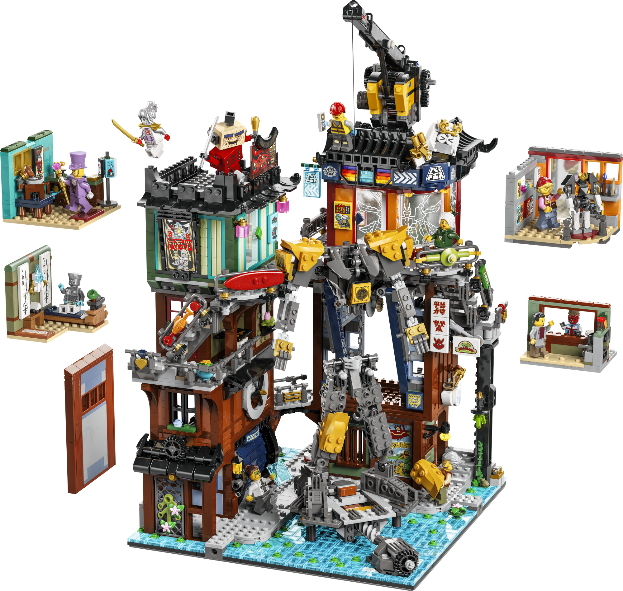 The 3,244-piece LEGO NINJAGO City Workshops set, spanning four stories, features a mechanic workshop, two working cranes, a customizable mech toy, and apartments, stores, and restaurants that can be detached for separate play, aiming to inspire both ninjas and collectors.